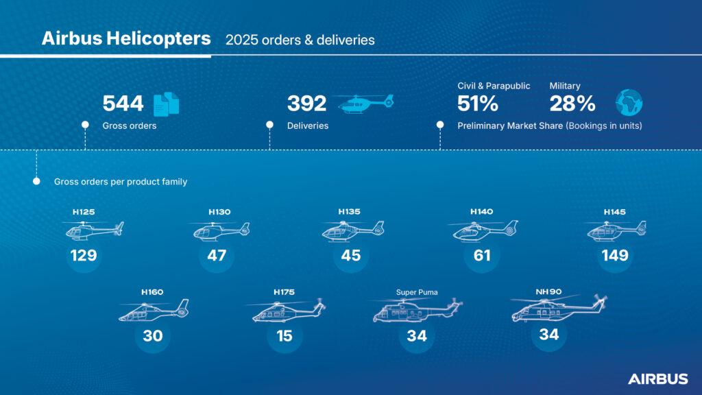 Airbus Helicopters recorded 544 gross orders and delivered 392 helicopters in 2025, reflecting strong demand across civil, parapublic and military markets worldwide.
