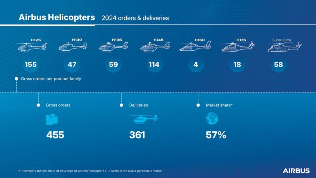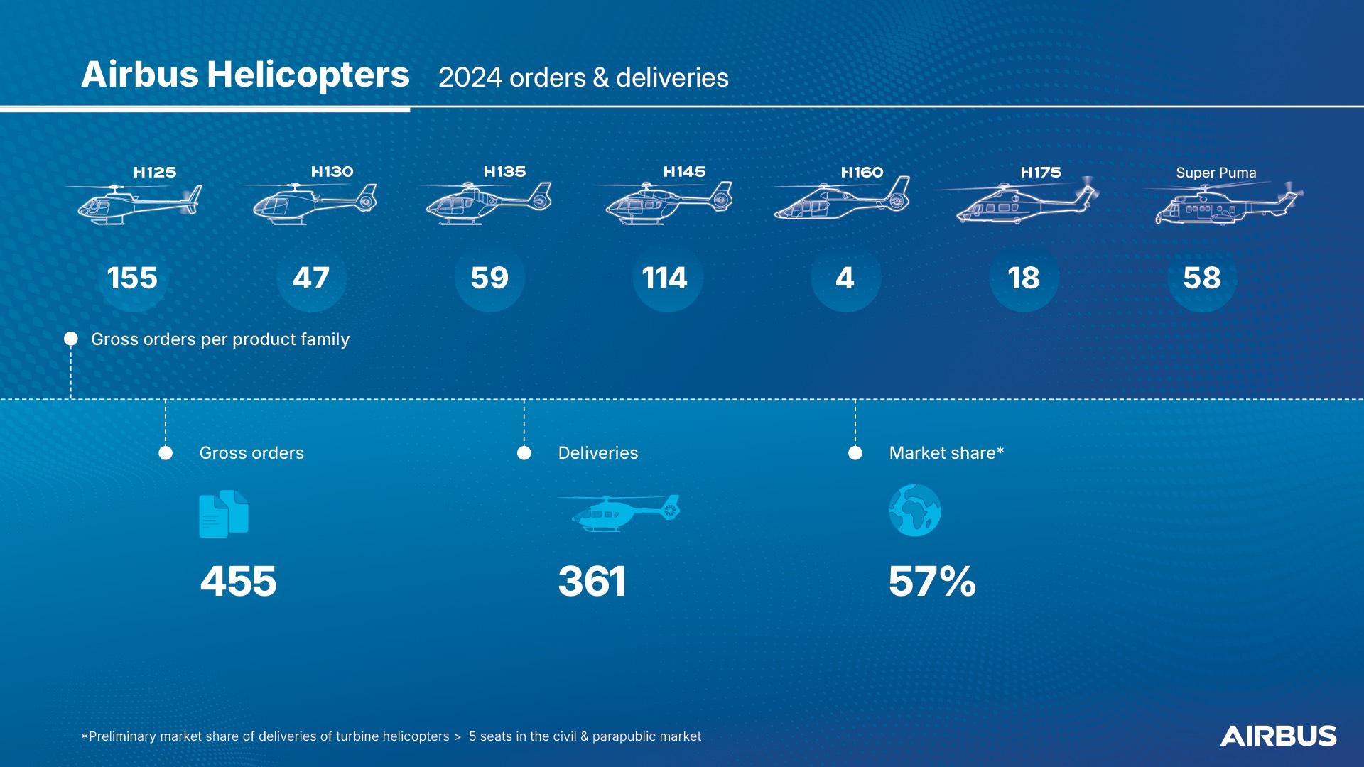 Marignane, France, 27 January 2025 – Airbus Helicopters logged 455 gross orders (net: 450) in 2024, highlighting a steady market growth with a strong performance this year for its light, light twin-engined, and heavy helicopters. The orders came from 182 customers in 42 countries. The Company delivered 361 helicopters in 2024, resulting in a preliminary 57% share of the civil and parapublic market.