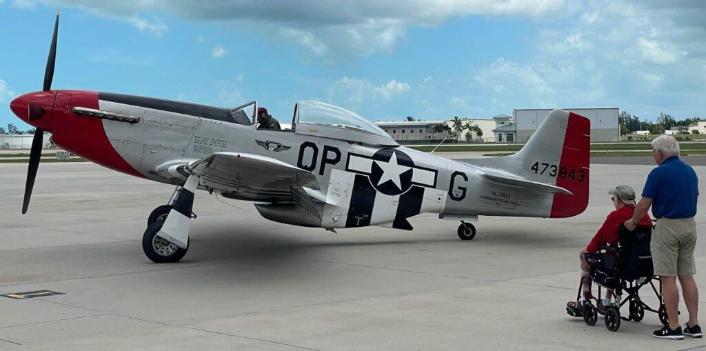 A small group of friends and family had gathered at the general aviation terminal of Naples Airport, but MacClarence had no idea what was about to pull up on the tarmac. The sound of the engine was unmistakable for this seasoned veteran, and he was delighted to see a P-51 pull up and cut its engine. It was a true visit back in time for the WWII Distinguished Flying Cross recipient.