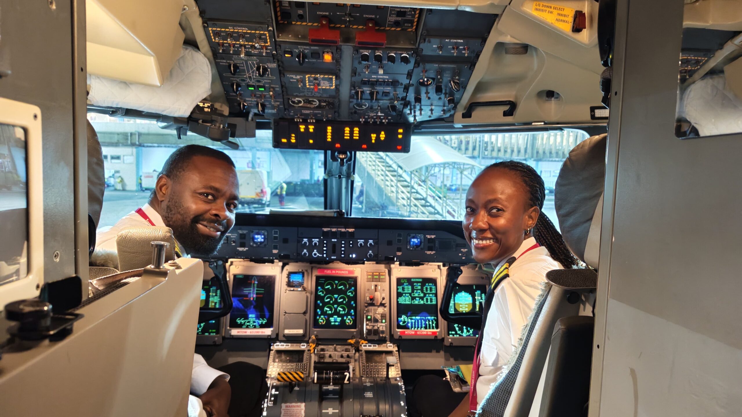 Caption: Captain David Kirera (L) and First Officer Sharon Murila during a stopover in Addis Ababa.