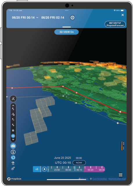 Integrating MTI Ltd.’s 3D aviation weather visualization technology with KEYVAN Aviation’s certified navigation database offers a powerful, professional-grade solution for flight operators. This combination enables dynamic, weather-aware flight planning by overlaying accurate, real-time and forecast weather data onto precise routes and flight plans in a portable 3D environment.