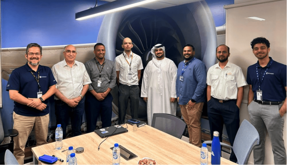 SOURCE AND IMAGE: GE AEROSPACE. CAPTION: The kaizen was facilitated by Francisco Hernandez (far left). Also participating in the kaizen along with representatives from Etihad Airways were GE Aerospace’s Bashar Doleh (second from left), Matthew Adams (fourth from left), and Adam Daud (far right).