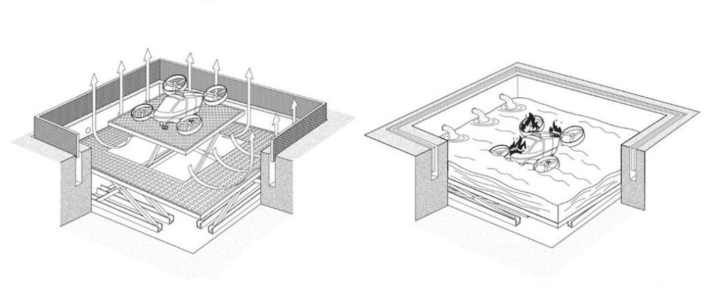 The water is held within a sealed substructure beneath the vertipad to eliminate environmental hazards. The design has been engineered to meet or exceed both FAA and EASA safety standards.
