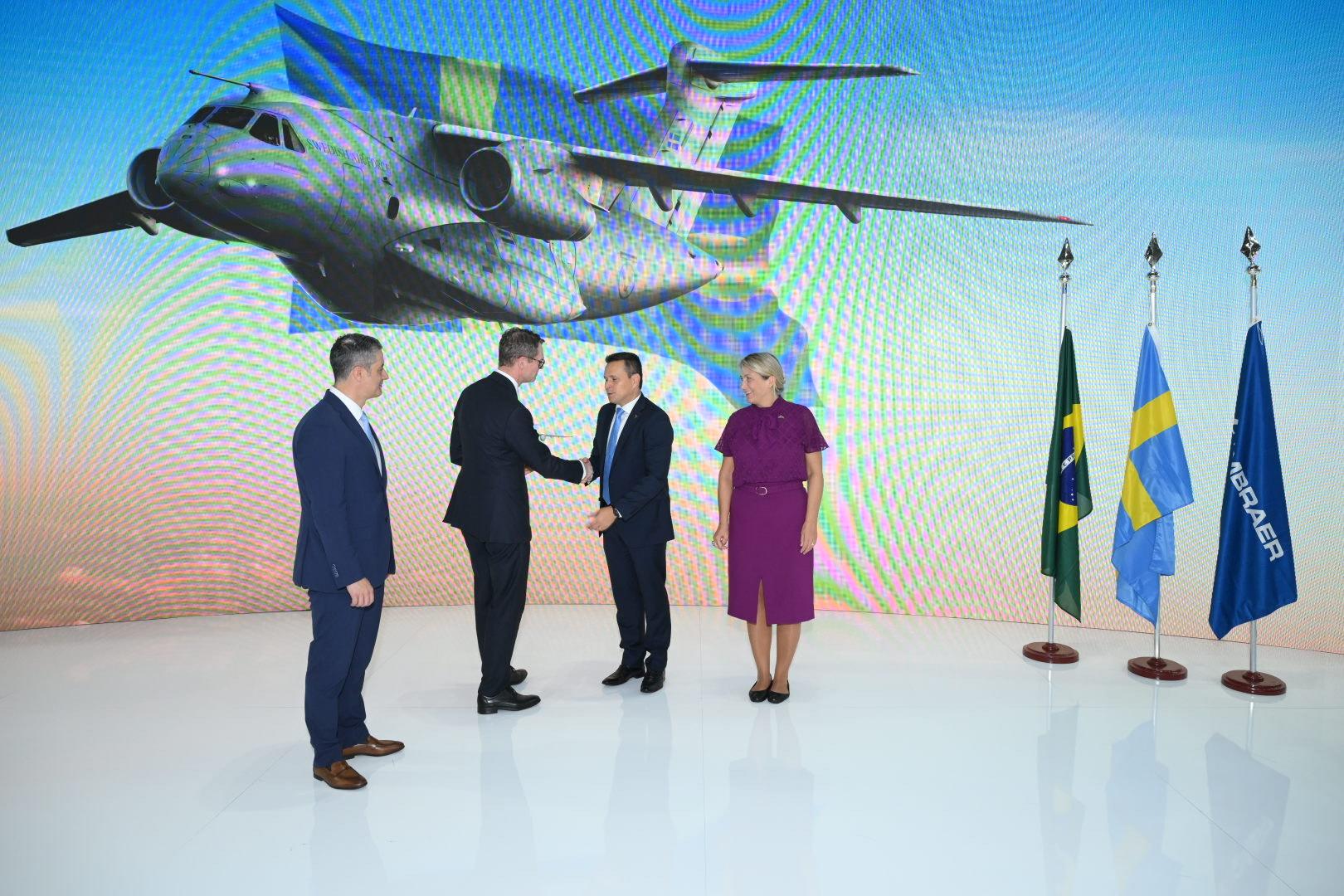 SOURCE AND IMAGE©: EMBRAER. CAPTION: Left to right : Frederico Lemos CCO, Embraer, Defence & Security, Peter Sandwall, State Secretary to Minister for Defence from Sweden and Bosco da Costa Junior, president and CEO of Embraer Defence & Security, and Mrs Karin Wallensteen Ambassador of Sweden to Brazil.